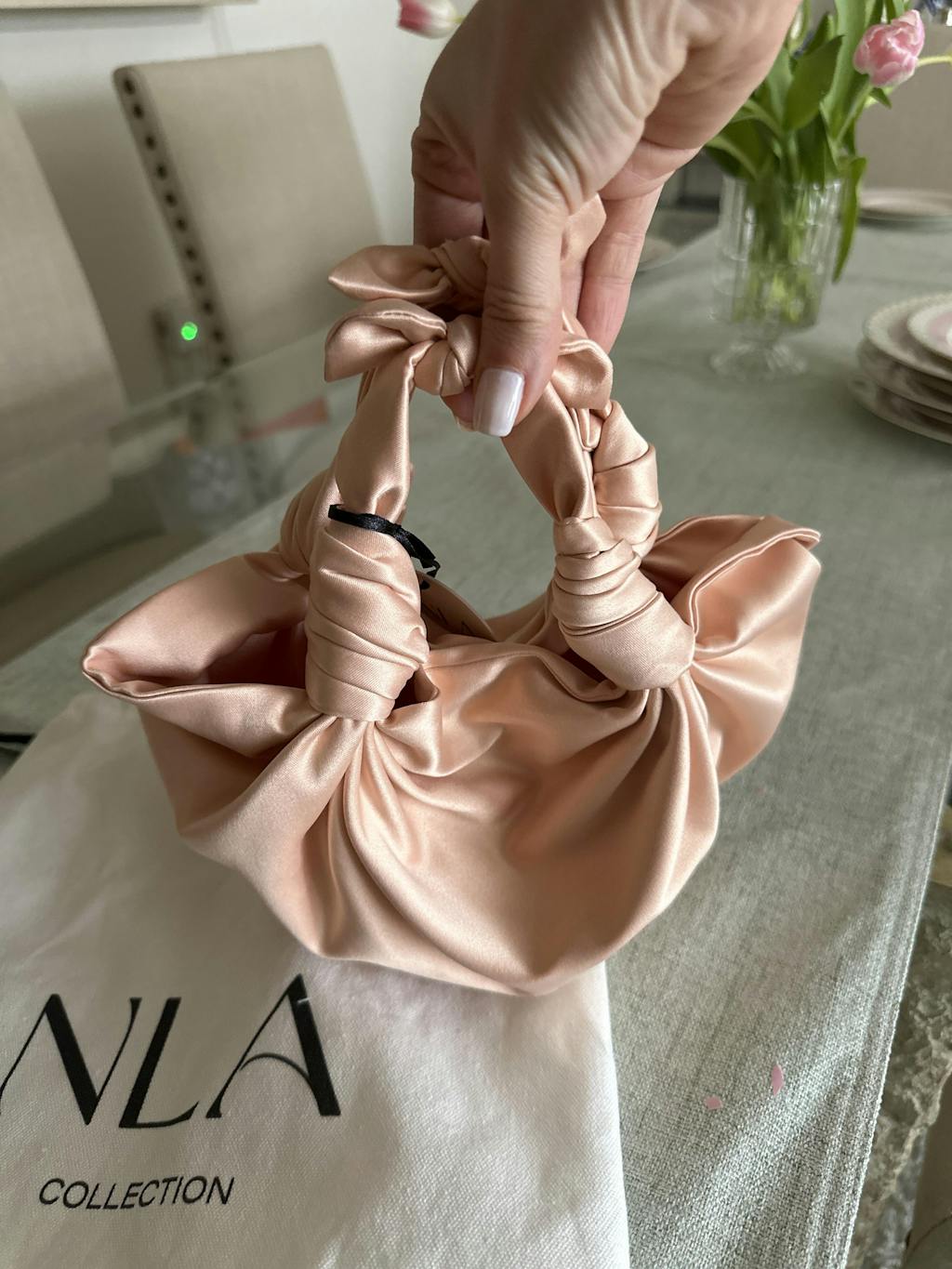 The NLA bag is so simply elegant and beautiful you almost for get how functional it is. I have never had a bag that I can hang on my wrist comfortably and hold a glass of wine and a plate and be able to talk to fellow guests. It fits my phone etc and looks stunning. The colors are beautiful… I’m a little obsessed. I own the champagne, black, hot pink and gold colors. Love, love, love this bag!